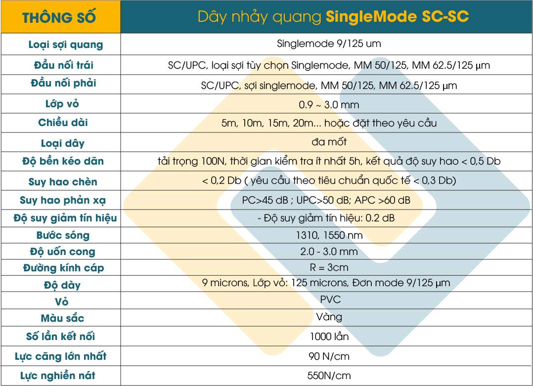 Dây nhảy SC-SC/UPC có thiết kế cơ bản với 2 đầu nối conecter loại SC-SC đầu vuông to màu xanh dương (xanh nước biển) màu vang nổi bật, với các chiều dài tương ứng với kích thước, khoảng cách giữa các thiết bị (3m, 5m, 10m, 15m, 20m...)tất nhiên là khoảng cách này có thể linh động tùy theo nhu cầu sử dụng của khách hàng.